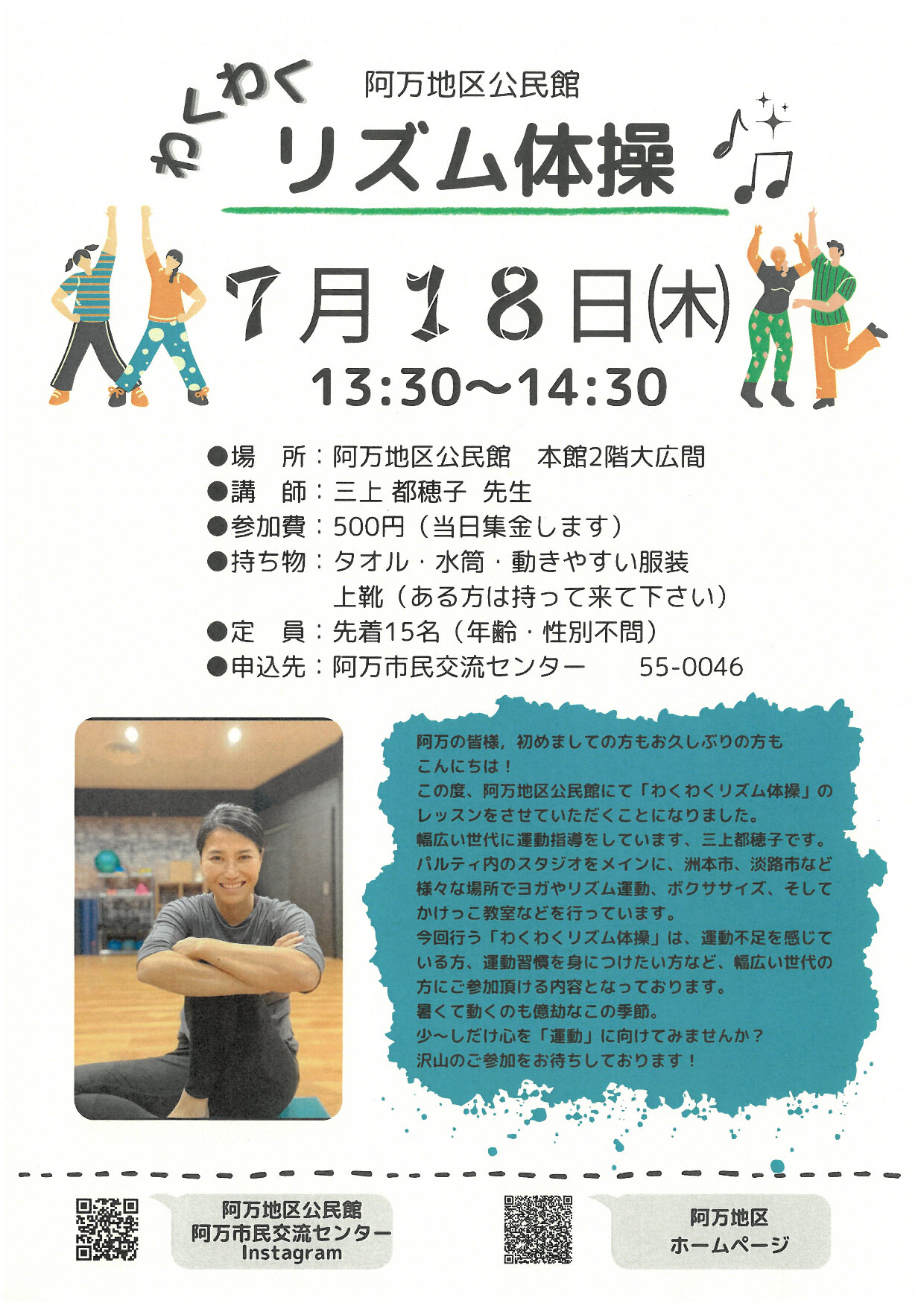 7/18(木)13時半から三上都穂子先生による「わくわくリズム体操」が開催されます。