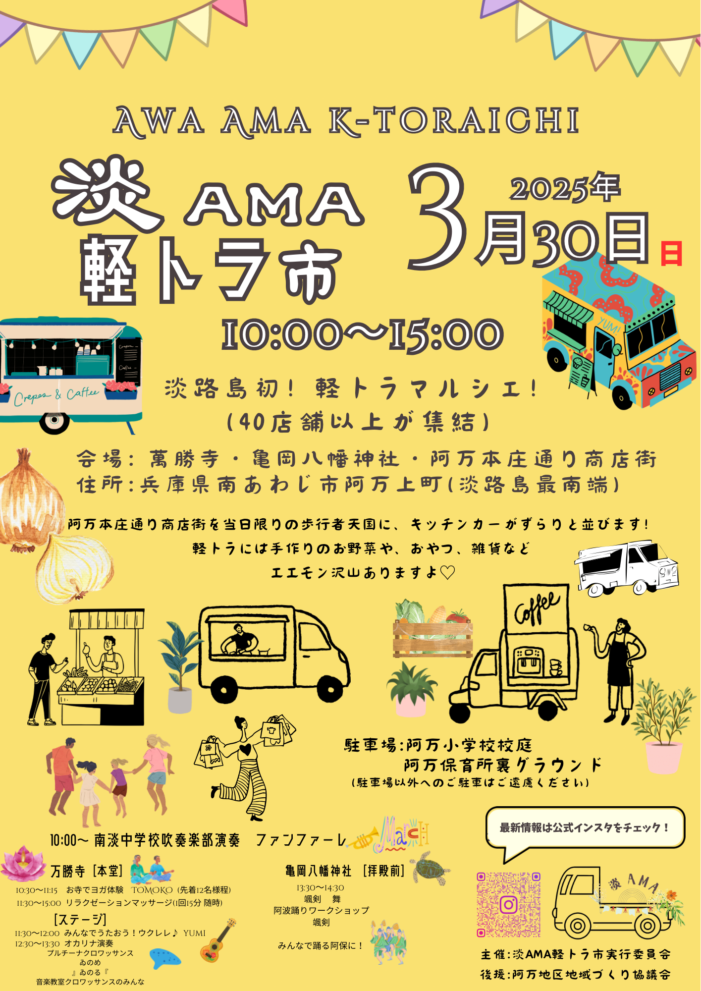 出店はキッチンカー、軽トラ、軽バンなどなど40店舗以上!ヨガ体験やワークショップもあるので盛り上がること間違いなしです!詳細はチラシをご覧ください。軽トラ市のインスタグラムでは出店者情報などを掲載していますのでフォローしてくださいね。→淡AMA軽トラ市のインスタグラムはこちら