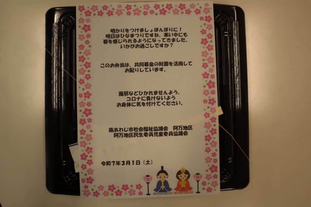 3/1(日)阿万地区民生児童委員会の皆さんによる「ひとり暮らし高齢者への見守り弁当配布」を行いました。今年は阿万地区内132人の方にお届けしました。見守り弁当の配布は、健康増進と安否確認を兼ねて毎年この時期に実施しています。 イベント報告 よかったらシェアしてね! URLをコピーしました! 3/9(日)AMAサバイバー開催のお知らせ 3/2(日)八重桜を植樹しました! この記事を書いた人 yosikun317 関連記事 12/21(土)阿万クリスマスイベントを開催しました! 2025年12月25日 12/18(木)寄せ植え教室を開催しました! 2025年12月25日 女性部合同視察研修を行いました! 2025年12月1日 11/18(火)ヨガクラスを開催しました! 2025年12月1日 11/8(日)阿万地区親善スポーツ大会を開催しました! 2025年11月11日 11/8(日)市長杯阿万地区老連グランドゴルフ大会を開催しました! 2025年11月11日 11/2(日)三海峡クリーンアップ大作戦を開催しました! 2025年11月5日 10/26(日)ハロウィン仮装行列2025を開催しました! 2025年11月5日 コメント コメントする コメントをキャンセルコメント ※ 名前 ※ メール ※ サイト 次回のコメントで使用するためブラウザーに自分の名前、メールアドレス、サイトを保存する。