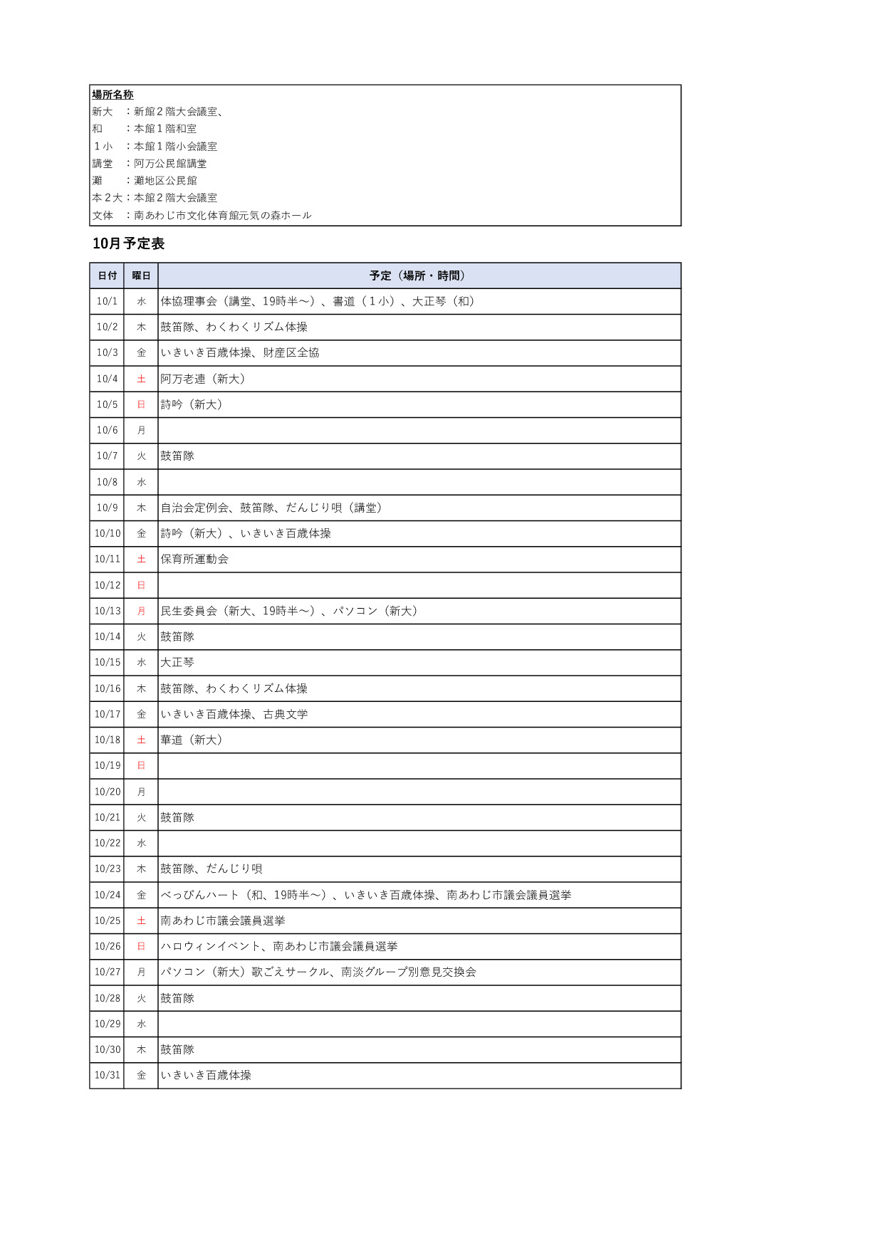 阿万市民交流センターの10月予定表です。お問合せなどは下記までお願いいたします。阿万市民交流センター:0799-55-0046(平日8時半~17時、土日祝日・年末年始は休館) 阿万市民交流センターからのお知らせ よかったらシェアしてね! URLをコピーしました! 9月予定表 8/30(土)アマプロジェクトを開催しました! この記事を書いた人 yosikun317 関連記事 9月予定表 2025年9月18日 わんちゃんと暮らす皆様へ 2025年4月23日 コメント コメントする コメントをキャンセルコメント ※ 名前 ※ メール ※ サイト 次回のコメントで使用するためブラウザーに自分の名前、メールアドレス、サイトを保存する。