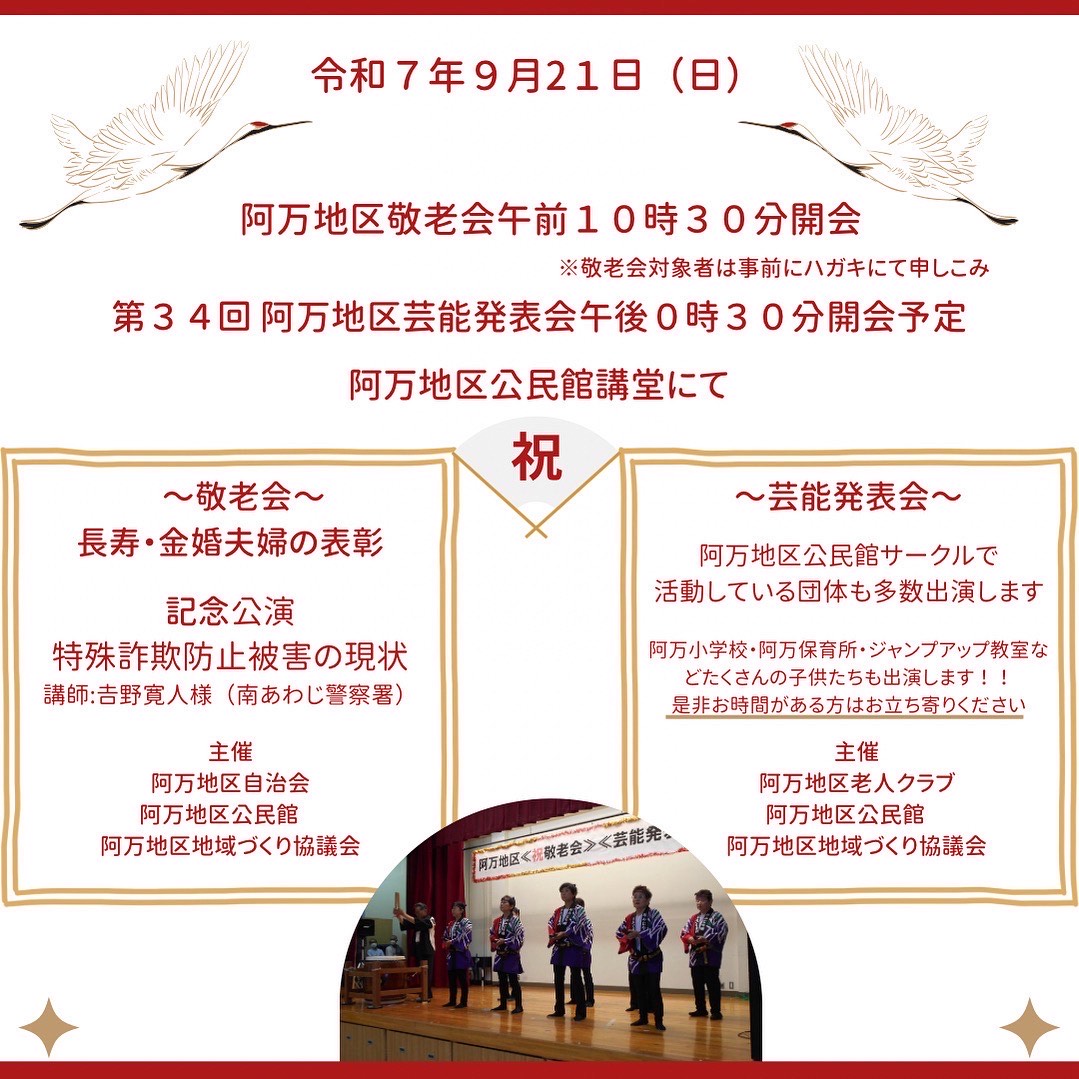 9/21(日)阿万地区公民館講堂にて「阿万地区敬老会・芸能発表会」を開催します。阿万地区敬老会は10時半からで、芸能発表会は0時30分からを予定しております。詳細はプログラムをご覧ください。たくさんのご来場お待ちしております♪ event よかったらシェアしてね! URLをコピーしました! 8/30(土)アマプロジェクトを開催しました! 地域おこし協力隊新聞9月号 この記事を書いた人 yosikun317 関連記事 2/15(日)男の料理教室開催のお知らせ 2026年1月9日 3/29(日)淡AMA軽トラ市開催のお知らせ 2025年12月16日 12/21(日)阿万クリスマスイベント2025開催のお知らせ 2025年12月16日 【募集】1/22(木)らんらんバス試乗体験 2025年12月1日 【募集】阿万地区文化展作品 2025年12月1日 12/18(木)寄せ植え教室のご案内 2025年10月15日 ヨガクラスのご案内 2025年10月15日 12/7(日)吹上げる恋`25開催のお知らせ 2025年10月10日 コメント コメントする コメントをキャンセルコメント ※ 名前 ※ メール ※ サイト 次回のコメントで使用するためブラウザーに自分の名前、メールアドレス、サイトを保存する。