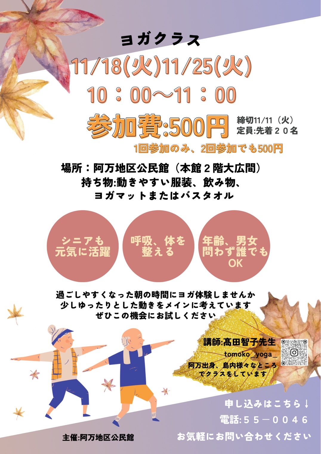 阿万地区公民館主催、11月18日(火)25日(火)10:00~11:00阿万地区公民館(本館2階大広間)にてヨガクラスを行います。2週にわたり開催予定で1回参加、2回参加でも参加費500円です。少しずつですが過ごしやすくなった朝にヨガ体験してみませんか?少しゆったりした動きをメインに考えています。誰でも参加OKです!初心者でも大丈夫です!お友達と一緒でも大丈夫です!ぜひご参加ください。