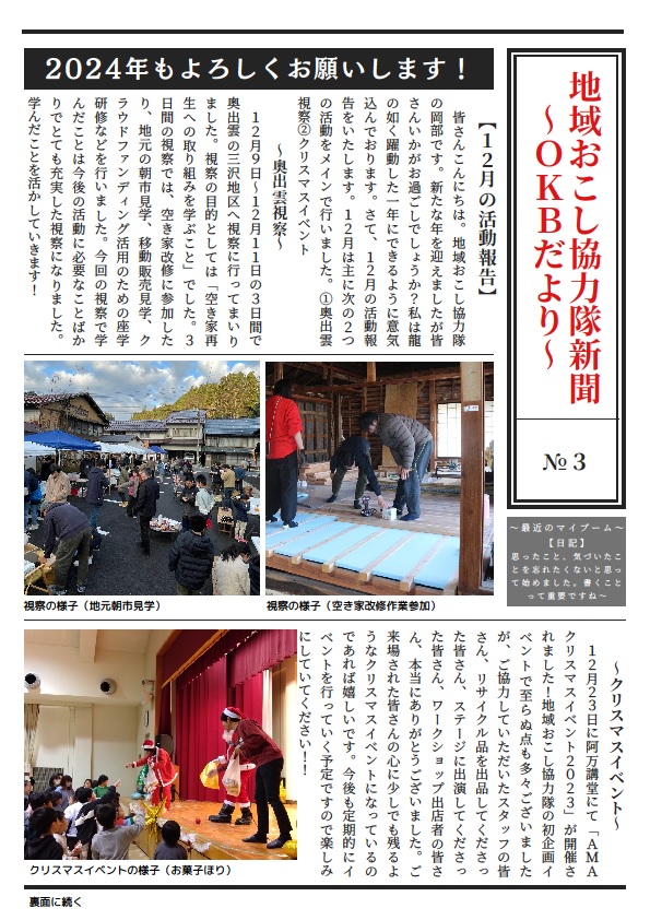 協力隊新聞1月号です。全文はこちらから~内容~・奥出雲視察・クリスマスイベント・インタビュー記事(NPO法人コミュニティスペースエモラボ代表理事 江本さん) -