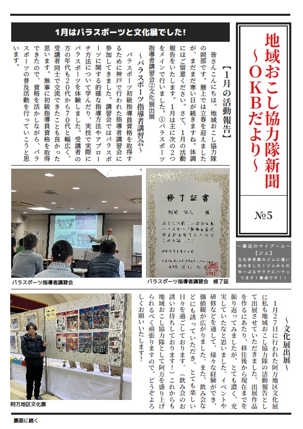 協力隊新聞2月号です。全文はこちらから~内容~・パラスポーツ指導者講習会・文化展出展・インタビュー記事(阿万地区連合自治会長 清水さん) -